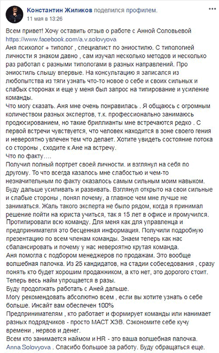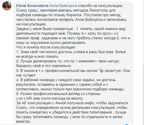От моих коллег, благодарных клиентов и знакомых ко мне стали приходить запросы на типирование команд, ведь все мы хотим работать в кайф, делать свое дело и процветать. И я искренне полюбила это дело. Ведь нет ничего приятней, чем помогать создавать нечто сильное и прекрасное!