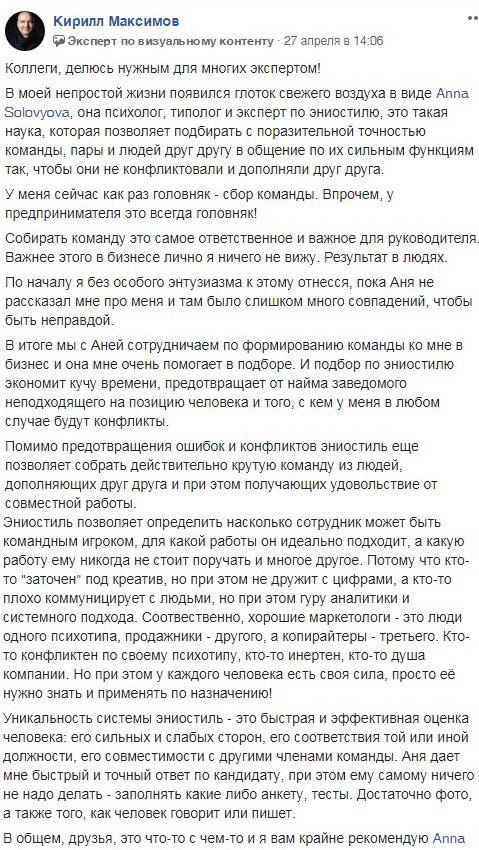 Я сертифицированный тренер эниостиля и типолог. В свое время я заинтересовалась психологией и, затем, эниостилем совсем не по причине подбора команд, а просто, чтобы лучше понимать себя. Увидев работу эниостиля на себе и своем окружении я начала помогать другим.
